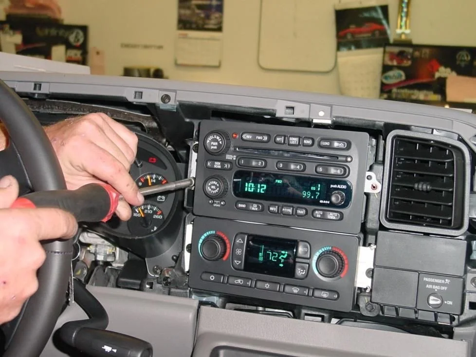 Remove original radio headunit to expose wiring to speakers and amplifier.
